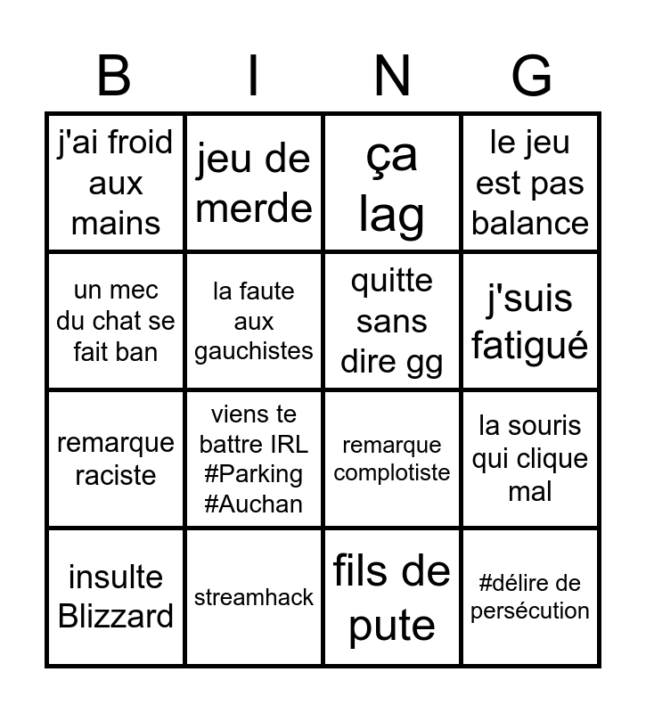 This bingo card has 16 words: streamhack, la souris qui clique mal, ça lag, j'ai froid aux mains, remarque raciste, jeu de merde, remarque complotiste, fils de pute, un mec du chat se fait ban, la faute aux gauchistes, insulte Blizzard, le jeu est pas balance, viens te battre IRL #Parking #Auchan, j'suis fatigué, quitte sans dire gg and #délire de persécution.