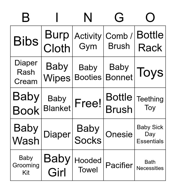 This bingo card has a free space and 24 words: Diaper, Baby Girl, Baby Booties, Baby Grooming Kit, Bottle Rack, Bibs, Diaper Rash Cream, Burp Cloth, Bottle Brush, Baby Socks, Baby Bonnet, Baby Book, Onesie, Baby Sick Day Essentials, Baby Wipes, Pacifier, Teething Toy, Activity Gym, Toys, Baby Blanket, Bath Necessities, Baby Wash, Comb / Brush and Hooded Towel.