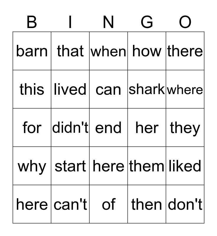 This bingo card has a free space and 24 words: start, can't, can, here, there, barn, this, that, her, here, shark, for, them, liked, lived, then, they, when, where, didn't, don't, why, how and of.