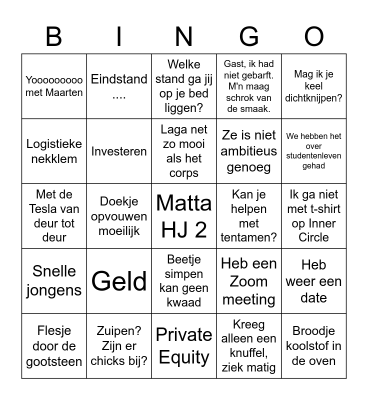 This bingo card has a free space and 24 words: Geld, Zuipen? Zijn er chicks bij?, Laga net zo mooi als het corps, Flesje door de gootsteen, Mag ik je keel dichtknijpen?, Yooooooooo met Maarten, Logistieke nekklem, Eindstand ...., Kan je helpen met tentamen?, Beetje simpen kan geen kwaad, Ze is niet ambitieus genoeg, Met de Tesla van deur tot deur, Heb een Zoom meeting, Heb weer een date, Investeren, Kreeg alleen een knuffel, ziek matig, Ik ga niet met t-shirt op Inner Circle, Welke stand ga jij op je bed liggen?, We hebben het over studentenleven gehad, Doekje opvouwen moeilijk, Broodje koolstof in de oven, Snelle jongens, Gast, ik had niet gebarft. M'n maag schrok van de smaak. and Private Equity.