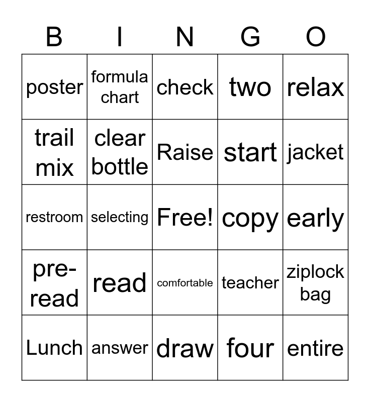 This bingo card has a free space and 30 words: answer, pause, selecting, breakfast, poster, check, clear bottle, comfortable, copy, draw, early, entire, four, hardest, jacket, library, teacher, pre-read, read, relax, restroom, should, formula chart, start, trail mix, two, ziplock bag, Lunch, Raise and time.