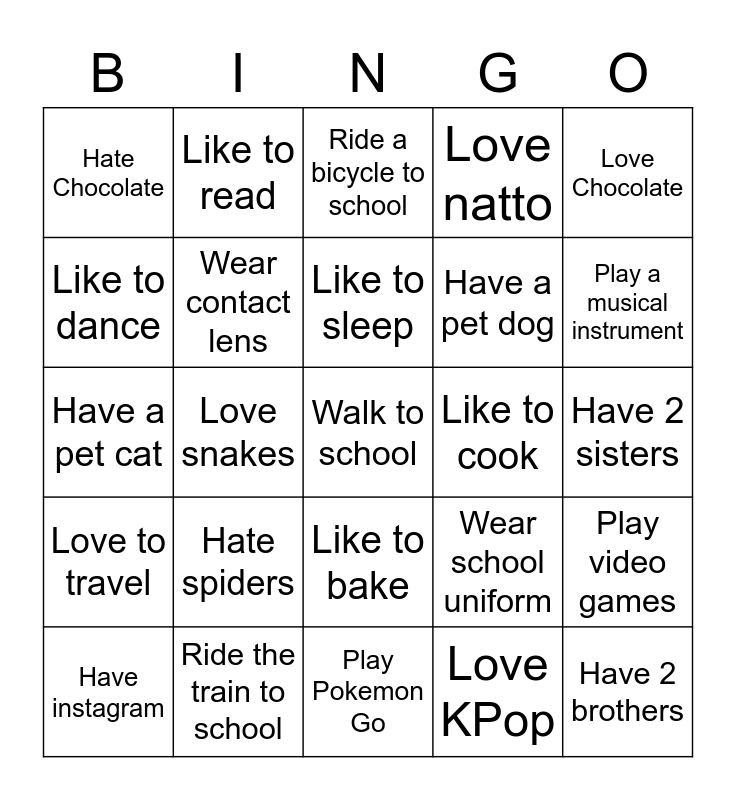 This bingo card has 25 words: Hate spiders, Play Pokemon Go, Like to sleep, Have instagram, Love Chocolate, Hate Chocolate, Like to dance, Like to read, Like to cook, Like to bake, Have a pet dog, Have a pet cat, Wear school uniform, Play video games, Wear contact lens, Have 2 brothers, Have 2 sisters, Ride a bicycle to school, Play a musical instrument, Love snakes, Walk to school, Ride the train to school, Love to travel, Love natto and Love KPop.
