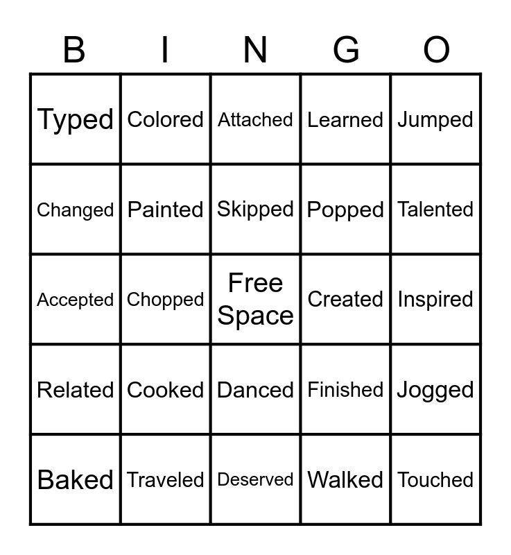This bingo card has a free space and 24 words: Baked, Cooked, Skipped, Walked, Jumped, Typed, Colored, Attached, Created, Inspired, Accepted, Painted, Finished, Jogged, Changed, Traveled, Deserved, Learned, Talented, Related, Chopped, Danced, Popped and Touched.