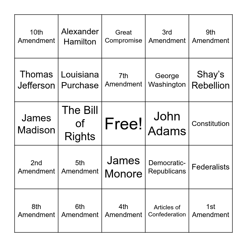 This bingo card has a free space and 24 words: 5th Amendment, 6th Amendment, 7th Amendment, 8th Amendment, 9th Amendment, 10th Amendment, Thomas Jefferson, Alexander Hamilton, John Adams, James Monore, George Washington, James Madison, Democratic-Republicans, Federalists, Louisiana Purchase, Articles of Confederation, Constitution, Great Compromise, Shay’s Rebellion, The Bill of Rights, 1st Amendment, 2nd Amendment, 3rd Amendment and 4th Amendment.