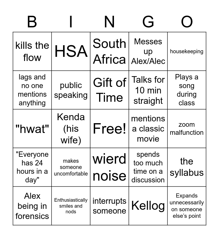This bingo card has a free space and 32 words: Kellog, Name a president, Kenda (his wife), princeton, "Everyone has 24 hours in a day", public speaking, housekeeping, the syllabus, HSA, West Chester Colors, Gift of Time, South Africa, I'm gonna stop talking, shades the admin, mentions a classic movie, the rhetoric leadership article, Alex being in forensics, "hwat", wierd noise, makes someone uncomfortable, spends too much time on a discussion, forget's someone's name/major, zoom malfunction, Enthusiastically smiles and nods, Expands unnecessarily on someone else’s point, Messes up Alex/Alec, Talks for 10 min straight, lags and no one mentions anything, kills the flow, interrupts someone, brings out the pompom or flag and Plays a song during class.