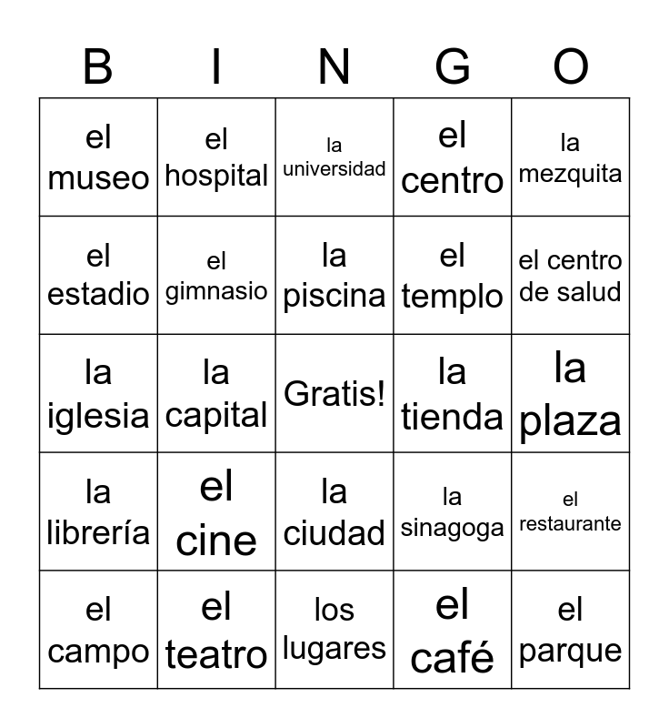 This bingo card has a free space and 24 words: el cine, el teatro, la piscina, el campo, la mezquita, el museo, el estadio, el hospital, la tienda, la ciudad, el templo, la iglesia, la sinagoga, el restaurante, el gimnasio, el café, la plaza, la universidad, el centro de salud, la capital, el parque, la librería, el centro and los lugares.