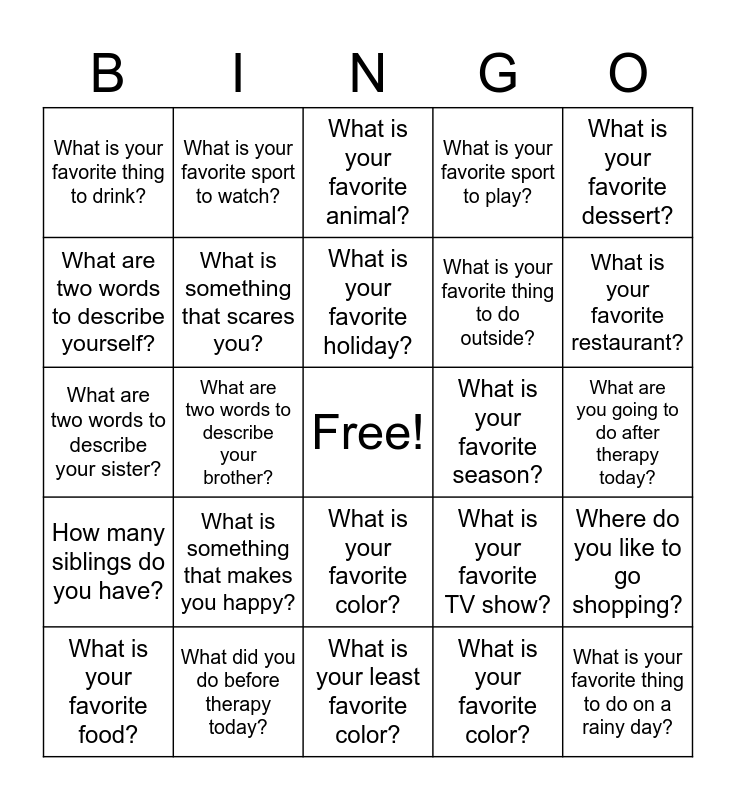 This bingo card has a free space and 24 words: What is something that makes you happy?, What did you do before therapy today?, What is your favorite holiday?, What is your favorite food?, What is your favorite dessert?, What is your favorite thing to drink?, What are two words to describe yourself?, What is your favorite sport to watch?, What is your favorite season?, What is your favorite color?, What is your favorite thing to do outside?, What are two words to describe your sister?, What is your favorite TV show?, Where do you like to go shopping?, What is something that scares you?, What is your favorite color?, What are you going to do after therapy today?, What is your favorite animal?, What is your favorite restaurant?, What are two words to describe your brother?, What is your favorite thing to do on a rainy day?, How many siblings do you have?, What is your favorite sport to play? and What is your least favorite color?.