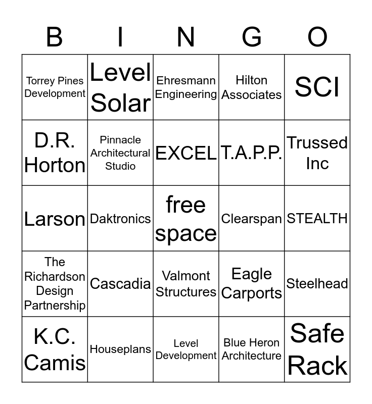 This bingo card has a free space and 24 words: Cascadia, Houseplans, EXCEL, K.C. Camis, SCI, Torrey Pines Development, D.R. Horton, Level Solar, Clearspan, Valmont Structures, T.A.P.P., Larson, Eagle Carports, Steelhead, Pinnacle Architectural Studio, Blue Heron Architecture, STEALTH, Ehresmann Engineering, Trussed Inc, Daktronics, Safe Rack, The Richardson Design Partnership, Hilton Associates and Level Development.