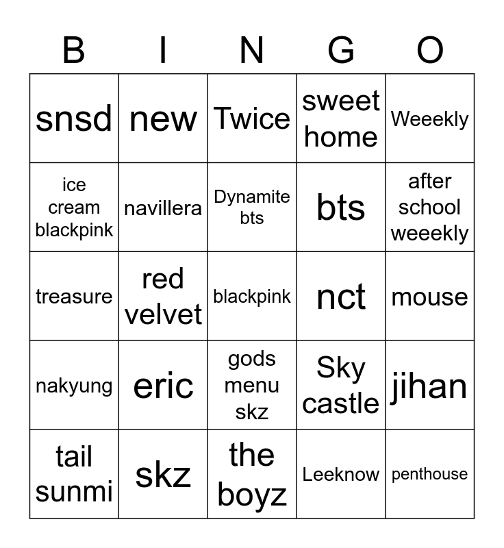 This bingo card has a free space and 24 words: eric, skz, Dynamite bts, tail sunmi, Weeekly, snsd, ice cream blackpink, new, nct, gods menu skz, bts, treasure, Sky castle, jihan, navillera, Leeknow, mouse, Twice, after school weeekly, red velvet, penthouse, nakyung, sweet home and the boyz.