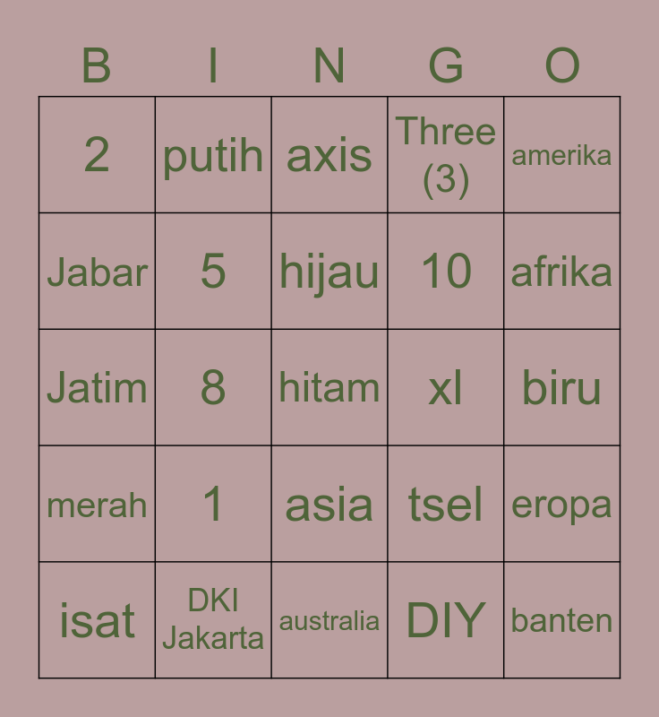 This bingo card has a free space and 24 words: 1, DKI Jakarta, hijau, isat, amerika, 2, Jabar, putih, xl, asia, 10, Jatim, tsel, eropa, 5, DIY, biru, axis, afrika, 8, banten, merah, Three (3) and australia.