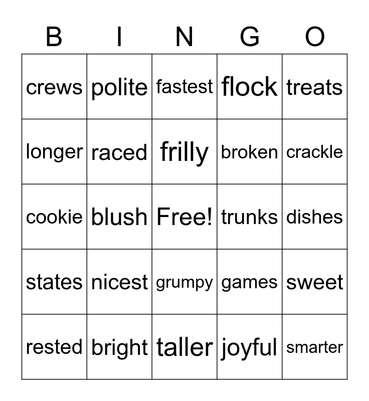 This bingo card has a free space and 24 words: nicest, bright, frilly, rested, treats, crews, longer, polite, trunks, grumpy, broken, cookie, games, sweet, raced, joyful, dishes, fastest, crackle, blush, smarter, states, flock and taller.