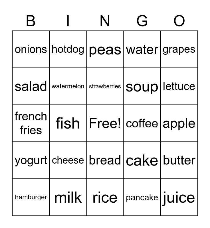 This bingo card has a free space and 24 words: cheese, milk, strawberries, hamburger, grapes, onions, salad, hotdog, coffee, bread, soup, french fries, cake, butter, watermelon, pancake, apple, peas, lettuce, fish, juice, yogurt, water and rice.