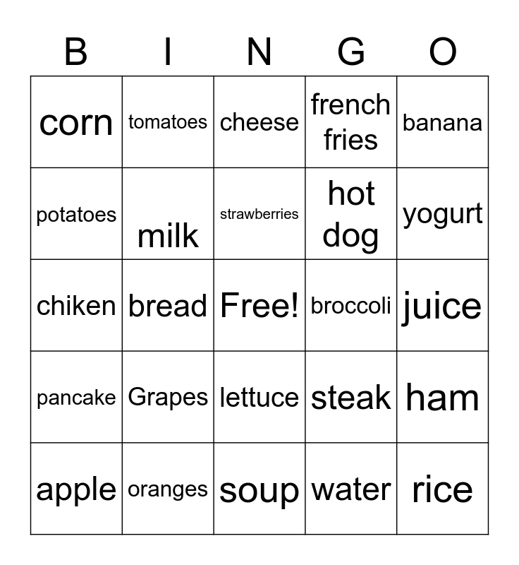 This bingo card has a free space and 24 words: Grapes, oranges, strawberries, apple, banana, corn, potatoes, tomatoes, broccoli, lettuce, hot dog, chiken, steak, ham, milk, water, juice, cheese, yogurt, bread, rice, pancake, french fries and soup.