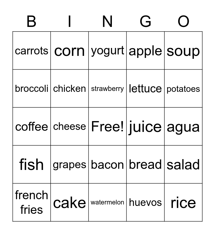 This bingo card has a free space and 24 words: grapes, cake, strawberry, french fries, soup, carrots, broccoli, corn, juice, bacon, lettuce, coffee, bread, salad, chicken, huevos, agua, yogurt, potatoes, cheese, rice, fish, apple and watermelon.