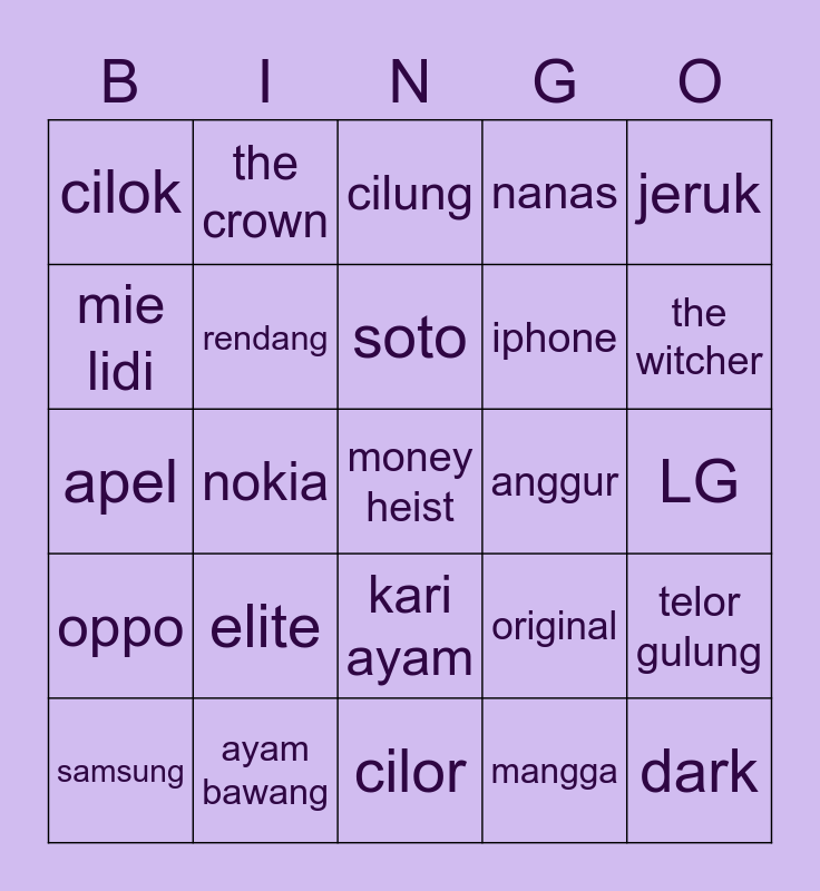 This bingo card has 25 words: elite, cilor, soto, samsung, jeruk, cilok, mie lidi, the crown, anggur, kari ayam, iphone, apel, original, telor gulung, rendang, dark, LG, cilung, the witcher, nokia, money heist, ayam bawang, oppo, nanas and mangga.