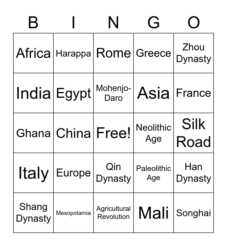 This bingo card has a free space and 24 words: Europe, Mesopotamia, Mohenjo-Daro, Shang Dynasty, Zhou Dynasty, Africa, India, Harappa, Neolithic Age, Qin Dynasty, Asia, Ghana, Paleolithic Age, Han Dynasty, Egypt, Mali, Silk Road, Rome, France, China, Songhai, Italy, Greece and Agricultural Revolution.