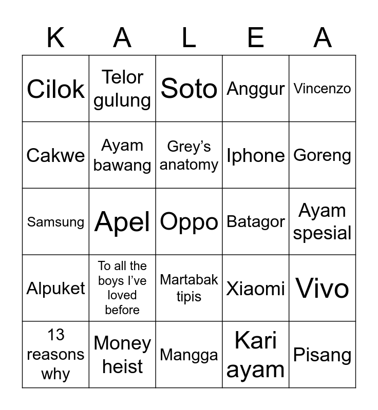 This bingo card has a free space and 24 words: To all the boys I’ve loved before, Money heist, Grey’s anatomy, 13 reasons why, Vincenzo, Cilok, Cakwe, Telor gulung, Batagor, Martabak tipis, Iphone, Samsung, Xiaomi, Vivo, Ayam bawang, Kari ayam, Ayam spesial, Soto, Goreng, Apel, Pisang, Alpuket, Anggur and Mangga.