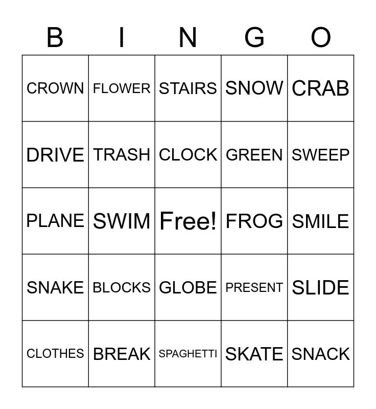 This bingo card has a free space and 24 words: BLOCKS, BREAK, CLOCK, CLOTHES, CRAB, CROWN, DRIVE, FLOWER, FROG, GLOBE, GREEN, PLANE, PRESENT, SLIDE, TRASH, SKATE, SMILE, STAIRS, SWEEP, SWIM, SNACK, SNAKE, SNOW and SPAGHETTI.