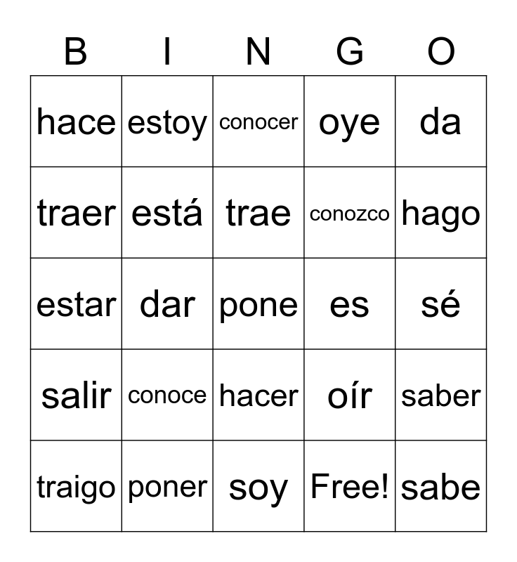 This bingo card has 32 words: Free!, pongo, dar, oigo, salir, está, da, saber, estoy, sabe, trae, conocer, cae, caer, es, doy, traigo, estar, hacer, conoce, oír, ser, sé, poner, pone, oye, conozco, traer, hace, soy, caigo and hago.
