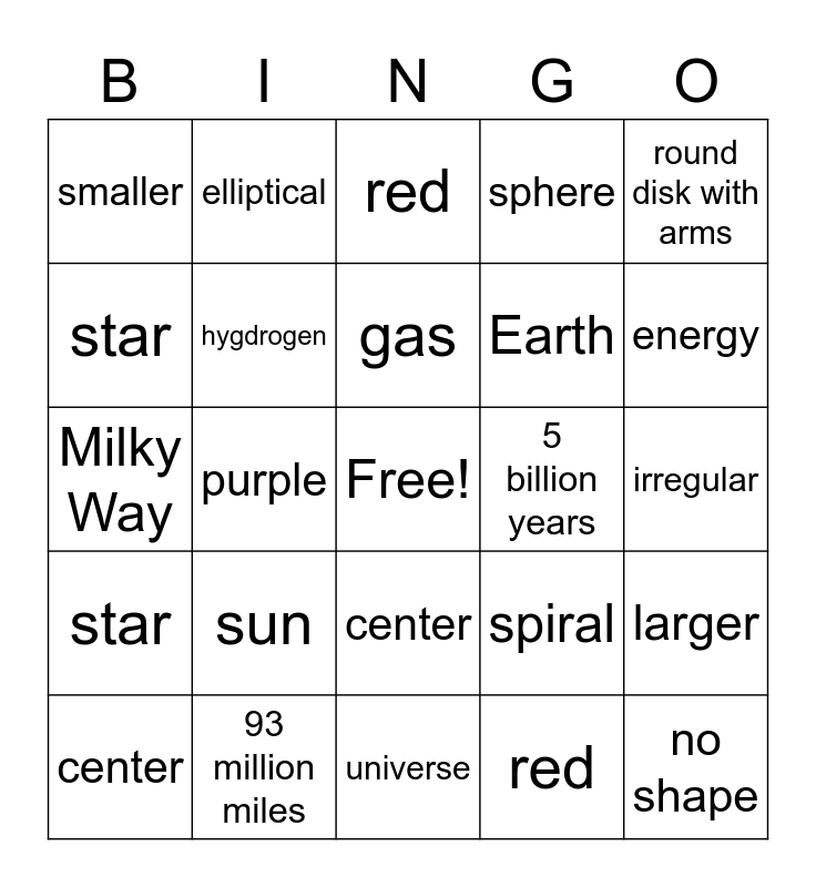This bingo card has a free space and 24 words: sun, 93 million miles, gas, center, round disk with arms, smaller, star, elliptical, 5 billion years, center, Earth, Milky Way, spiral, larger, hygdrogen, red, irregular, red, energy, purple, no shape, star, sphere and universe.