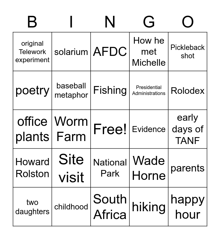 This bingo card has a free space and 36 words: Nationals, Sabbatical at Center for Budget and Policy Priorities, stay at-home dad, baseball metaphor, Wade Horne, Howard Rolston, Fishing, obscure baseball fact, Pickleback shot, NAWRS, Worm Farm, How he met Michelle, fellow Peace Corps members, Evidence, Rolodex, original Telework experiment, evaluation mishaps, Site visit, happy hour, AFDC, early days of TANF, parents, childhood, two daughters, South Africa, solarium, office plants, Covid vaccine, Presidential Administrations, poetry, New Orleans, teaching high school, hiking, National Park, Retirement trips and Music concerts.