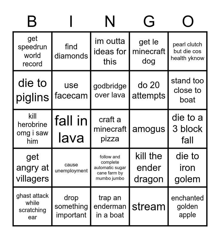 This bingo card has 25 words: cause unemployment, trap an enderman in a boat, godbridge over lava, ghast attack while scratching ear, pearl clutch but die cos health yknow, get speedrun world record, die to piglins, find diamonds, amogus, follow and complete automatic sugar cane farm by mumbo jumbo, do 20 attempts, kill herobrine omg i saw him, kill the ender dragon, die to iron golem, use facecam, enchanted golden apple, die to a 3 block fall, im outta ideas for this, stand too close to boat, fall in lava, craft a minecraft pizza, drop something important, get angry at villagers, get le minecraft dog and stream.