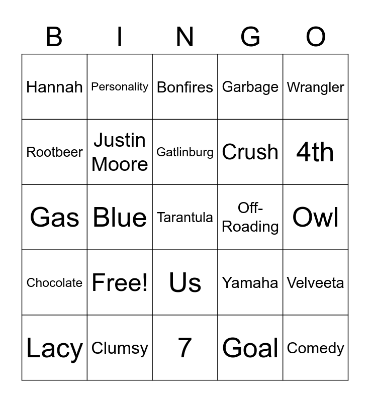 This bingo card has 25 words: Free!, 7, Gatlinburg, Lacy, Wrangler, Hannah, Rootbeer, Personality, Off-Roading, Us, Crush, Gas, Yamaha, Velveeta, Justin Moore, Comedy, Owl, Bonfires, 4th, Blue, Tarantula, Clumsy, Chocolate, Garbage and Goal.