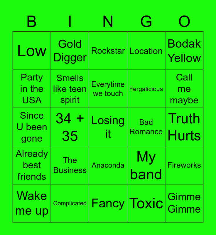 This bingo card has 37 words: Peaches, In my feelings, S&M, Smells like teen spirit, Fireworks, The Business, Everytime we touch, Arcade, Bodak Yellow, Swimming Pools, 34 + 35, Location, Losing it, Truth Hurts, Party in the USA, Already best friends, Work, Rockstar, Anaconda, Bad Romance, Low, Call me maybe, Wake me up, Fancy, Replay, Toxic, Gold Digger, Uptown Funk, I love it, Unwritten, Shake it off, Complicated, Since U been gone, Gimme Gimme, My band, Fergalicious and Sk8terboi.