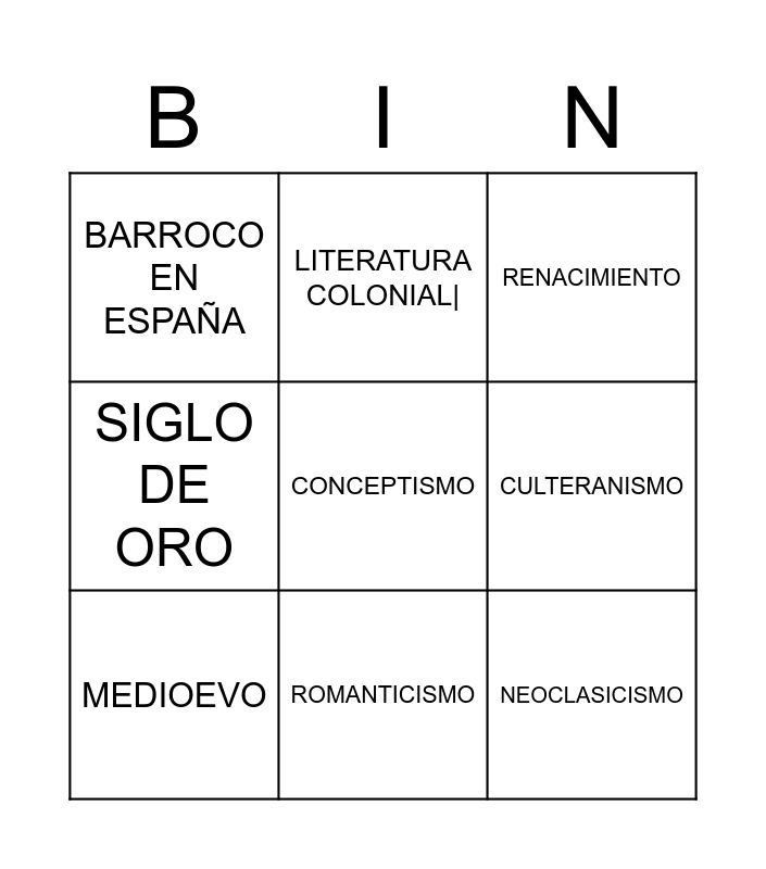 This bingo card has 9 words: MEDIOEVO, RENACIMIENTO, LITERATURA COLONIAL|, SIGLO DE ORO, BARROCO EN ESPAÑA, CULTERANISMO, CONCEPTISMO, NEOCLASICISMO and ROMANTICISMO.