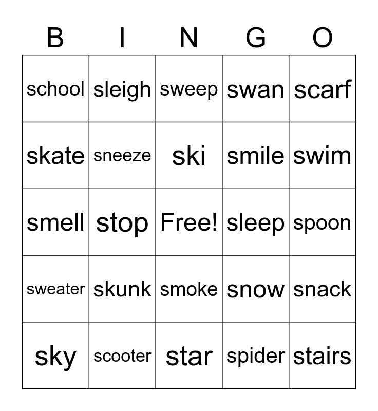 This bingo card has a free space and 24 words: skunk, scooter, ski, sky, scarf, school, skate, sleigh, sleep, smoke, smile, smell, snow, snack, sneeze, spider, spoon, sweep, swim, stop, stairs, sweater, swan and star.