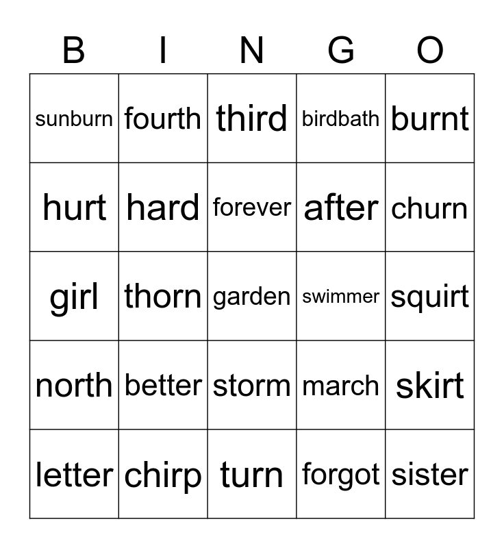 This bingo card has 30 words: chirp, market, thorn, perm, sunburn, third, hard, storm, swimmer, turn, squirt, garden, forgot, sister, churn, first, march, north, better, burnt, girl, farmer, fourth, after, hurt, birdbath, skirt, letter, forever and remember.