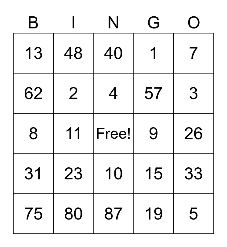 This bingo card has a free space and 24 words: 23, 80, 4, 75, 7, 13, 62, 48, 9, 10, 57, 8, 15, 33, 2, 19, 26, 40, 3, 11, 5, 31, 1 and 87.