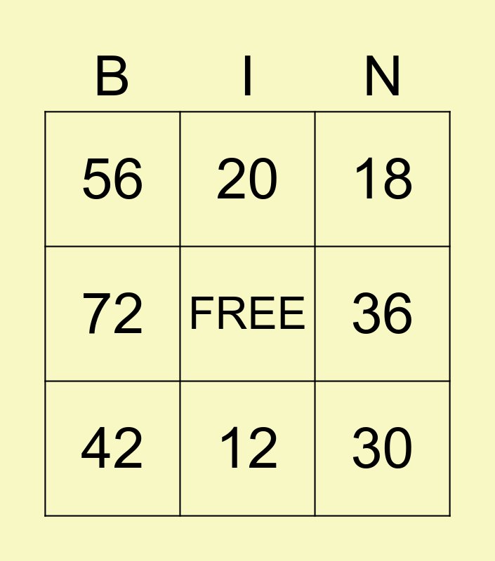 This bingo card has a free space and 8 words: 36, 18, 20, 42, 56, 30, 72 and 12.