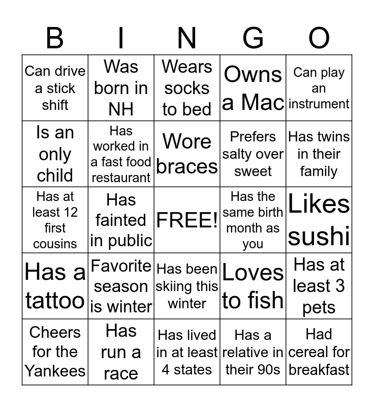 This bingo card has a free space and 24 words: Favorite season is winter, Has run a race, Wore braces, Cheers for the Yankees, Can play an instrument, Can drive a stick shift, Is an only child, Was born in NH, Has the same birth month as you, Has been skiing this winter, Prefers salty over sweet, Has at least 12 first cousins, Loves to fish, Has at least 3 pets, Has worked in a fast food restaurant, Has a relative in their 90s, Likes sushi, Wears socks to bed, Has twins in their family, Has fainted in public, Had cereal for breakfast, Has a tattoo, Owns a Mac and Has lived in at least 4 states.