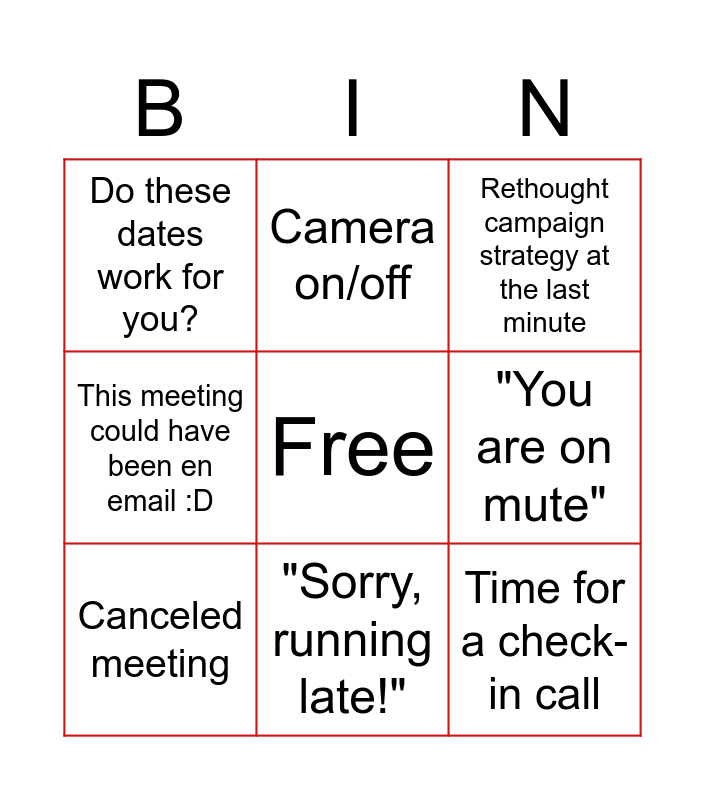 This bingo card has a free space and 8 words: "You are on mute", Rethought campaign strategy at the last minute, Camera on/off, Canceled meeting, Do these dates work for you?, Time for a check-in call, This meeting could have been en email :D and "Sorry, running late!".