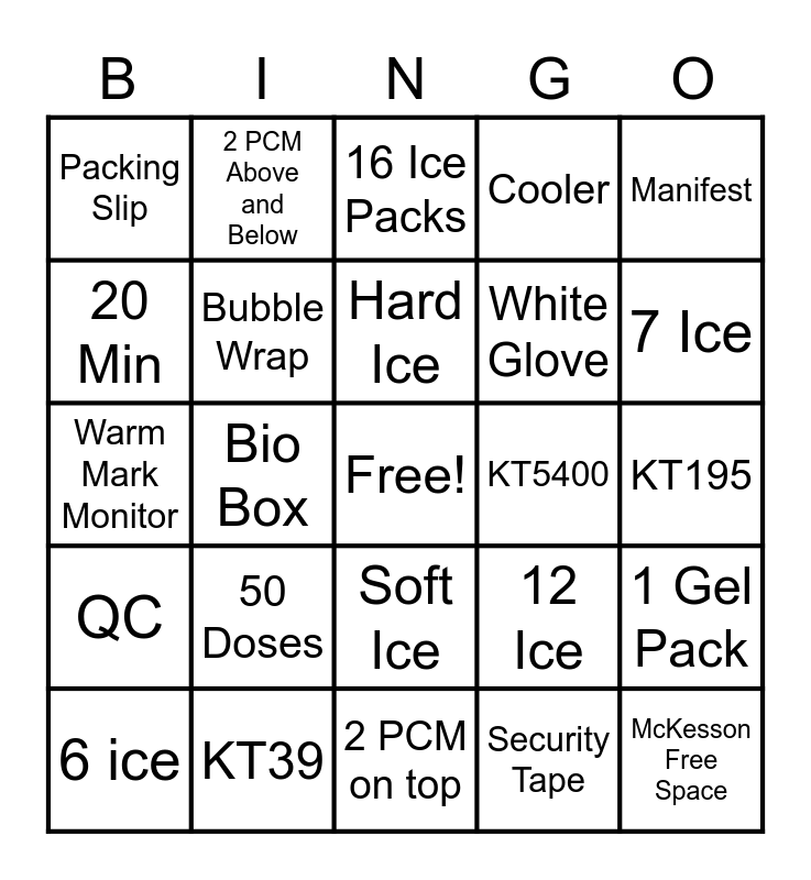 This bingo card has a free space and 40 words: PCM, Warm Mark Monitor, Payload, Bubble Wrap, KT39, Soft Ice, Hard Ice, Double Check, Manifest, QC, Bio Box, Cooler, McKesson Free Space, KT195, KT5400, 50 Doses, HU, Packing Slip, EID, 16 Ice Packs, 1 Gel Pack, Security Tape, White Glove, 20 Min, Utility Team, KT91, Medium, Large, Extra Large, Small, Red Flag, 6 ice, Totes, 12 Ice, 7 Ice, 2 PCM on top, 4 PCM on Top, 1 PCM Above and Below, 2 PCM Above and Below and Covid Insert.