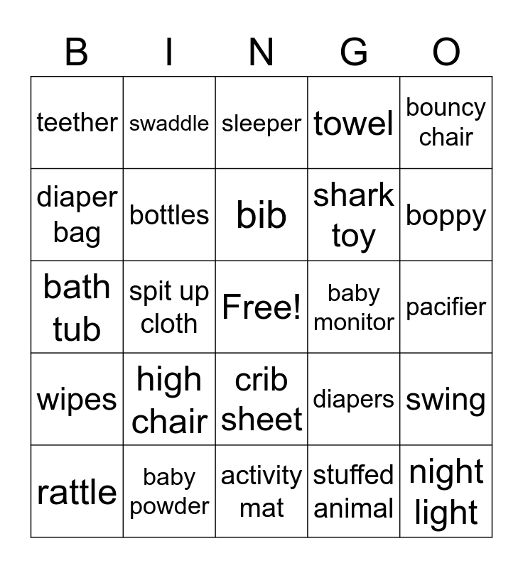 This bingo card has a free space and 40 words: receiving blanket, bath tub, dress, bottles, baby powder, crib sheet, bib, shoes, bouncy chair, wipes, spit up cloth, towel, night light, pacifier, baby monitor, high chair, stroller, teether, cash, sleeper, swing, stuffed animal, shark toy, diaper bag, baby lotion, hat, baby shampoo, onesie, book, diaper rash cream, gift card, rattle, socks, diapers, boppy, activity mat, bath toys, baby carrier, swaddle and brush.