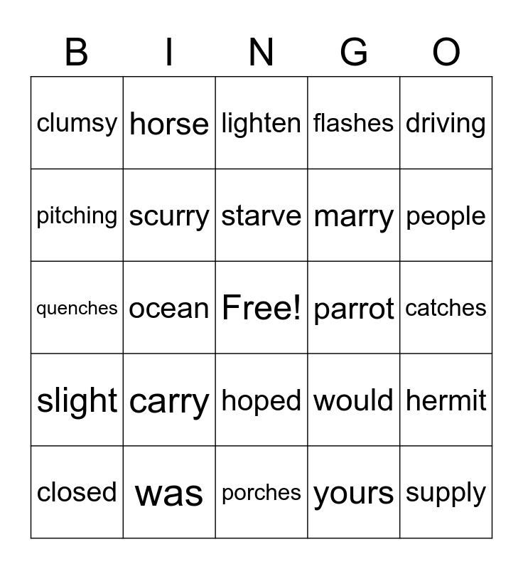 This bingo card has a free space and 31 words: porches, fetching, ocean, apply, clumsy, lighten, scurry, would, parrot, yours, catches, supply, swerve, jolly, people, tense, hermit, carry, slight, hoped, driving, shaker, closed, horse, marry, pitching, flashes, quenches, was, starve and tardy.