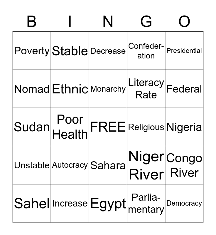 This bingo card has a free space and 24 words: Autocracy, Increase, Monarchy, Sahel, Presidential, Poverty, Nomad, Stable, Religious, Sahara, Literacy Rate, Sudan, Niger River, Congo River, Ethnic, Parlia- mentary, Nigeria, Decrease, Federal, Poor Health, Democracy, Unstable, Confeder- ation and Egypt.