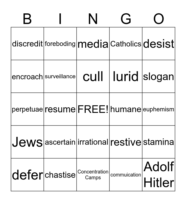 This bingo card has a free space and 24 words: ascertain, chastise, cull, defer, desist, discredit, encroach, foreboding, humane, irrational, lurid, perpetuae, restive, stamina, surveillance, commuication, euphemism, media, slogan, resume, Adolf Hitler, Jews, Catholics and Concentration Camps.