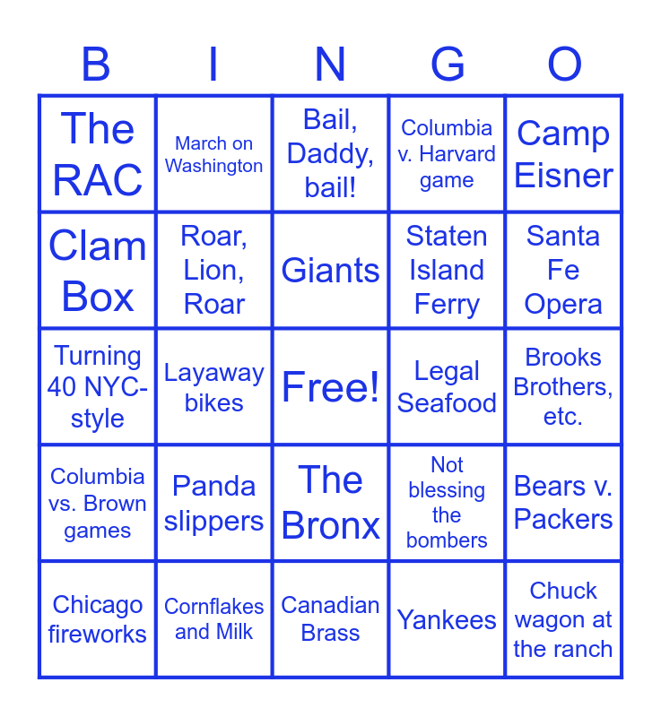 This bingo card has a free space and 26 words: The Bronx, Yankees, Giants, Cornflakes and Milk, Camp Eisner, The RAC, Clam Box, March on Washington, Brooks Brothers, etc., Not blessing the bombers, Staten Island Ferry, Turning 40 NYC-style, Bears v. Packers, Chicago fireworks, Layaway bikes, Outfitting Fred for work, Columbia v. Harvard game, Columbia vs. Brown games, Bail, Daddy, bail!, Chuck wagon at the ranch, Santa Fe Opera, Canadian Brass, Legal Seafood, Panda slippers, Roar, Lion, Roar and Purim in Cairo.