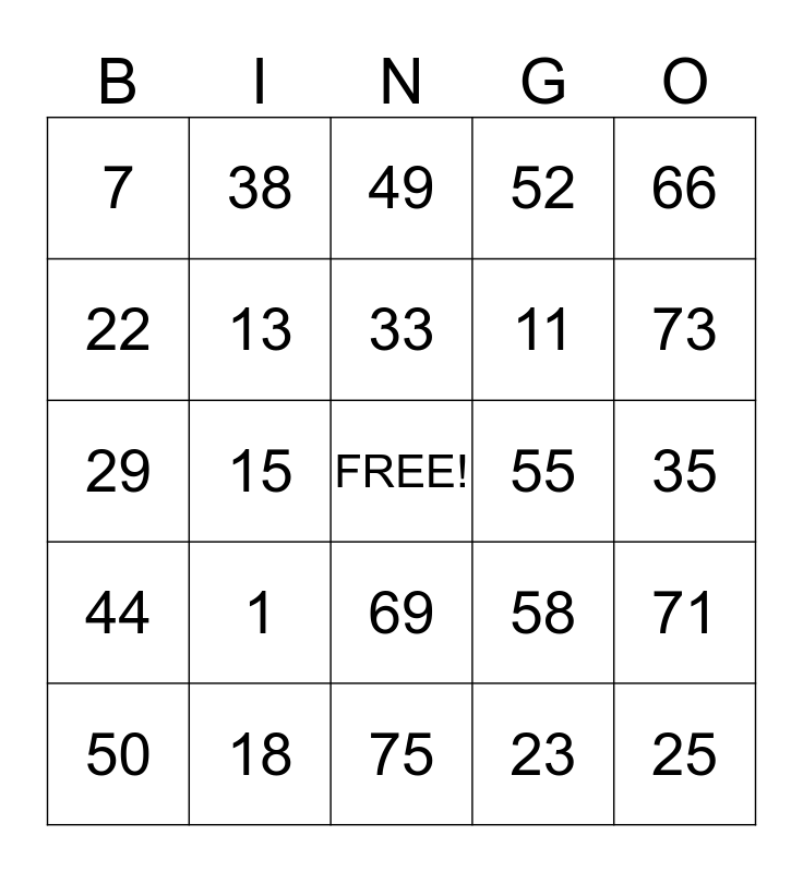 This bingo card has a free space and 24 words: 1, 18, 33, 50, 66, 7, 22, 38, 55, 69, 11, 29, 58, 71, 13, 23, 35, 49, 73, 15, 25, 44, 52 and 75.