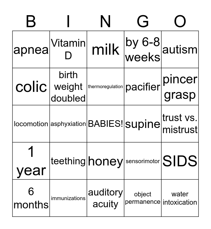 This bingo card has a free space and 24 words: teething, immunizations, thermoregulation, 6 months, autism, apnea, colic, Vitamin D, supine, honey, pacifier, locomotion, sensorimotor, SIDS, birth weight doubled, object permanence, trust vs. mistrust, milk, pincer grasp, asphyxiation, water intoxication, 1 year, by 6-8 weeks and auditory acuity.