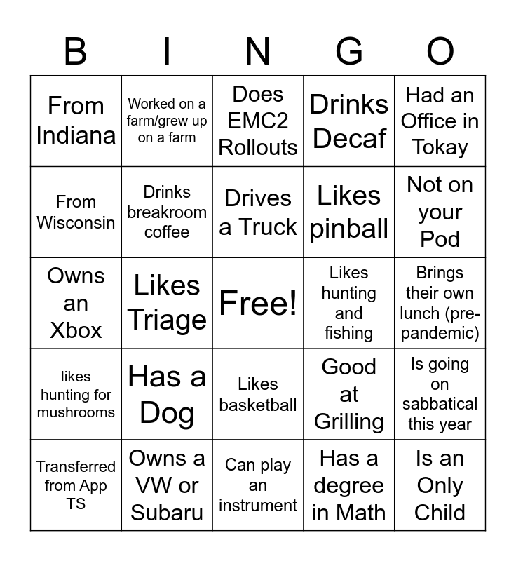 This bingo card has a free space and 24 words: Has a Dog, Owns a VW or Subaru, Drives a Truck, Transferred from App TS, Had an Office in Tokay, From Indiana, From Wisconsin, Worked on a farm/grew up on a farm, Likes hunting and fishing, Likes basketball, Likes pinball, Owns an Xbox, Good at Grilling, Is going on sabbatical this year, Drinks breakroom coffee, Has a degree in Math, Brings their own lunch (pre-pandemic), Does EMC2 Rollouts, Not on your Pod, Likes Triage, Is an Only Child, likes hunting for mushrooms, Drinks Decaf and Can play an instrument.