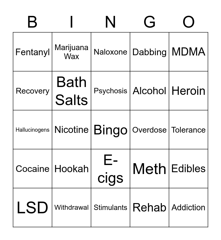 This bingo card has a free space and 29 words: LSD, Vaping, Nicotine, Marijuana, Fentanyl, Naloxone, Bath Salts, Hookah, Overdose, Withdrawal, Tolerance, Addiction, Stimulants, Rehab, Heroin, Opioids, E-cigs, Cocaine, MDMA, Hallucinogens, Meth, Spice, Alcohol, Recovery, Dabbing, Marijuana Wax, Edibles, Psychosis and Meth mouth.
