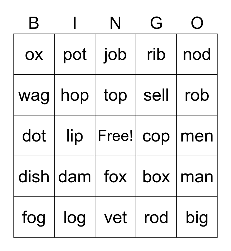 This bingo card has a free space and 34 words: mop, rod, jog, cot, dish, hop, nod, fog, pot, win, top, job, hot, beg, cop, rob, log, dot, dam, box, fox, dog, ox, men, vet, big, rib, dish, sell, wag, kid, lip, man and dad.