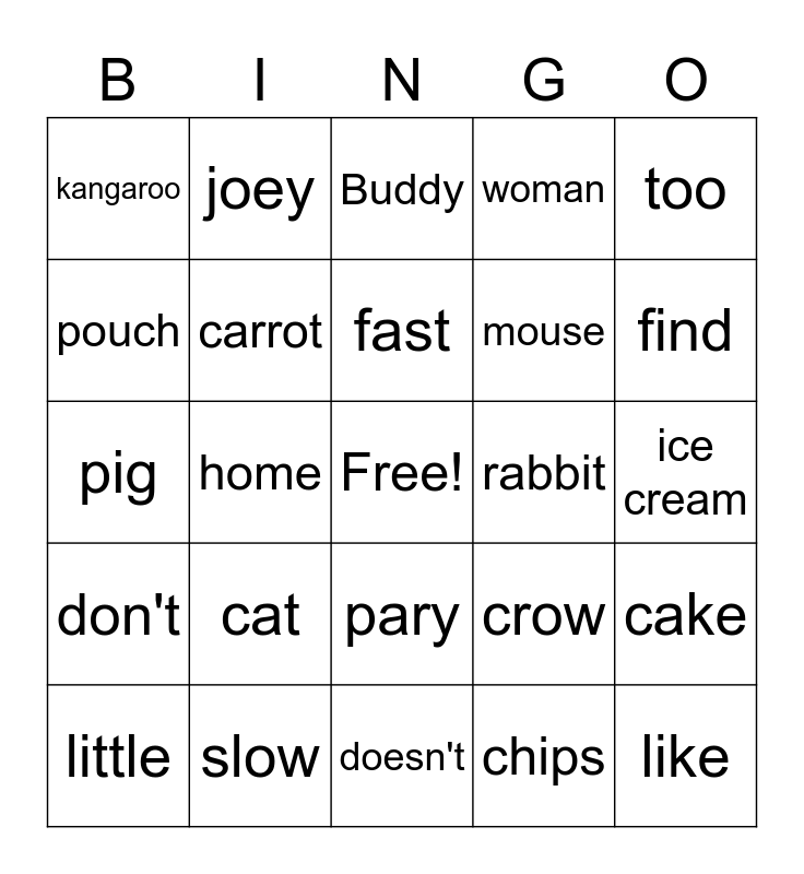 This bingo card has a free space and 24 words: cat, slow, fast, little, too, kangaroo, pouch, joey, rabbit, pary, mouse, pig, crow, cake, carrot, chips, ice cream, Buddy, find, home, like, don't, woman and doesn't.