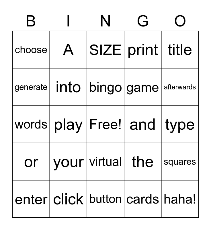 This bingo card has a free space and 24 words: enter, your, bingo, cards, title, choose, A, SIZE, and, type, words, into, the, squares, generate, click, button, print, afterwards, or, play, virtual, game and haha!.