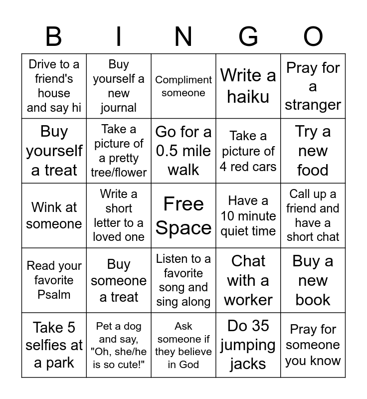 This bingo card has a free space and 24 words: Buy someone a treat, Pet a dog and say, "Oh, she/he is so cute!", Go for a 0.5 mile walk, Take 5 selfies at a park, Pray for a stranger, Drive to a friend's house and say hi, Buy yourself a treat, Buy yourself a new journal, Have a 10 minute quiet time, Listen to a favorite song and sing along, Take a picture of 4 red cars, Wink at someone, Chat with a worker, Buy a new book, Take a picture of a pretty tree/flower, Do 35 jumping jacks, Call up a friend and have a short chat, Compliment someone, Try a new food, Write a short letter to a loved one, Pray for someone you know, Read your favorite Psalm, Write a haiku and Ask someone if they believe in God.