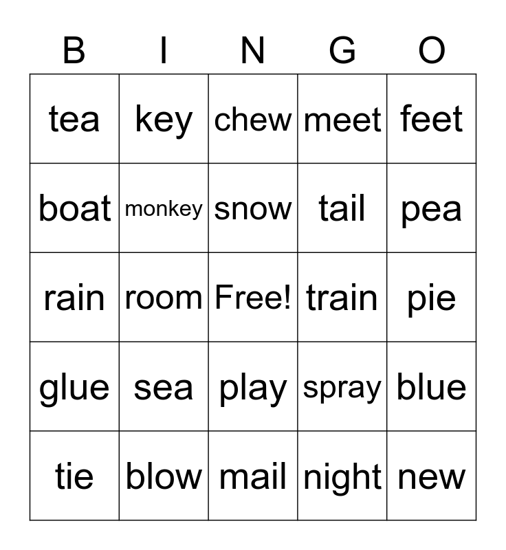 This bingo card has a free space and 24 words: sea, blow, snow, tie, feet, tea, boat, key, train, play, tail, rain, spray, blue, monkey, night, pie, chew, pea, room, new, glue, meet and mail.